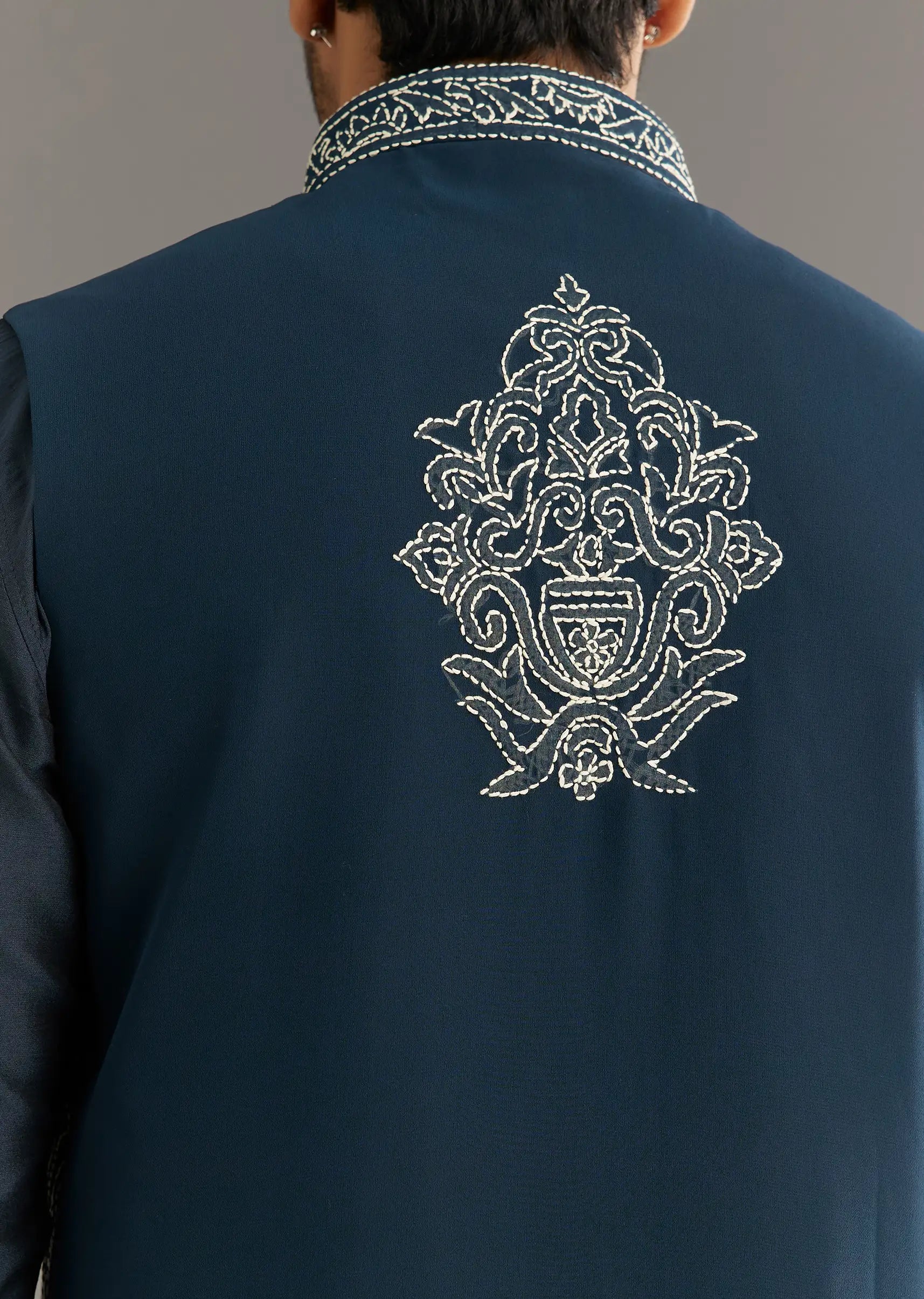 An elevated take on timeless tradition. This men’s kurta set comes in a refined blue tone, paired with a statement jacket adorned with delicate thread embroidery. The lightweight fabric keeps it comfortable, while the structured jacket adds sophistication and depth to the look.